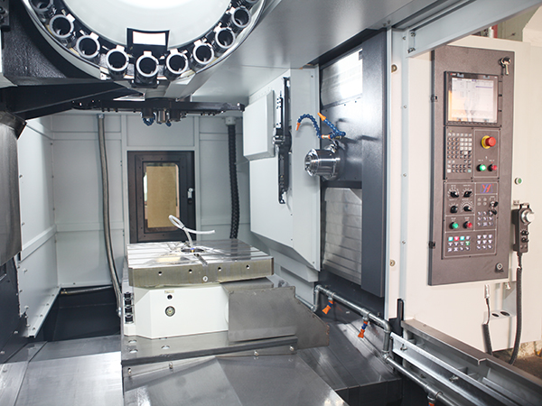 它們共同使用了一套工作平面系統(tǒng),并裝有回轉(zhuǎn)分度裝置,可任意旋轉(zhuǎn)角度實現(xiàn)多面、車銑復(fù)合加工;